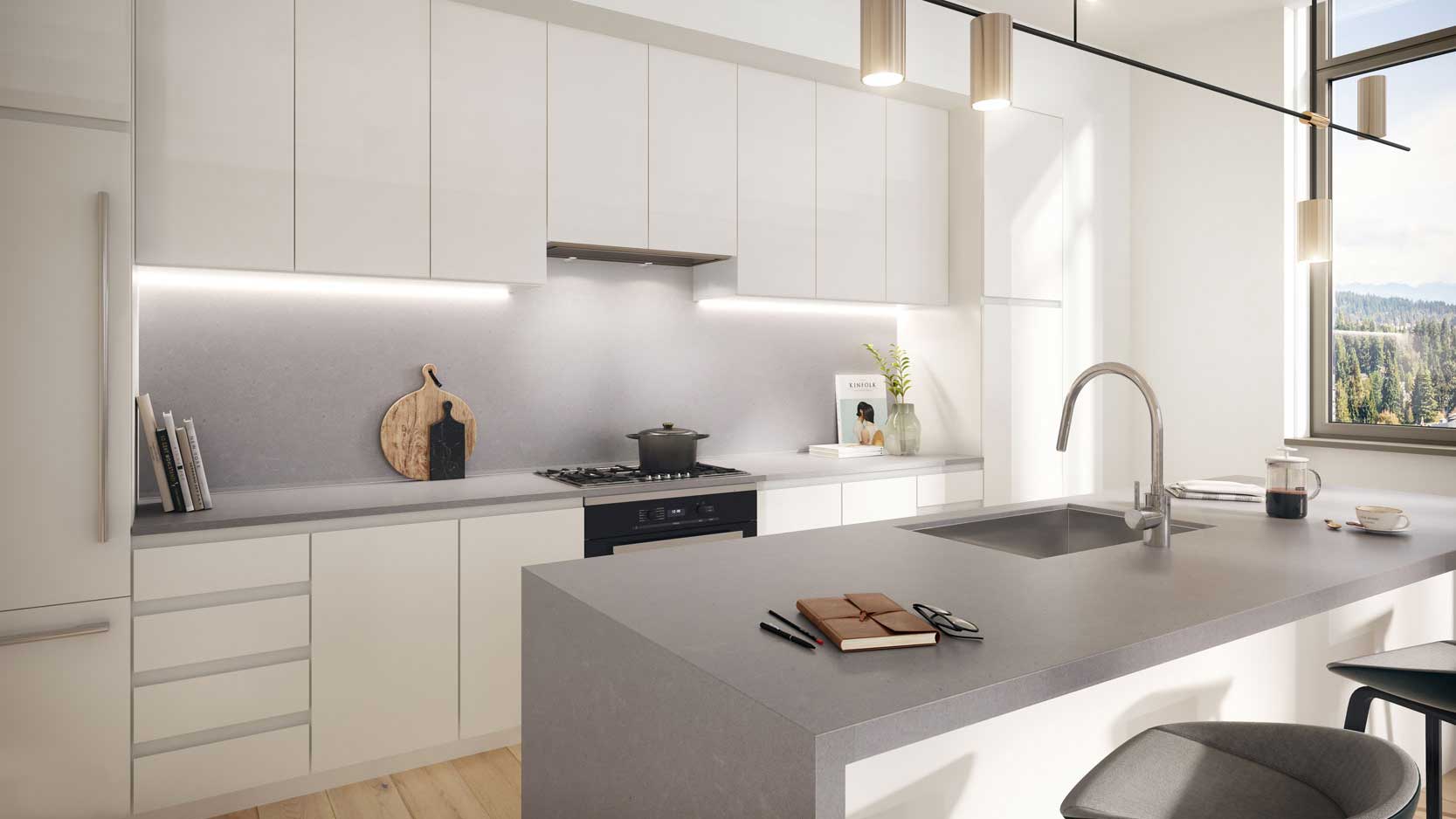 MARI Penthouses offer residents the peak of all that MARI offers: a chef’s kitchen of professional grade Gaggenau®️ and Thermador appliances, a mood-lit spa-like bathroom, generous walk-in closets, a gas fireplace and ceilings that ascend to almost twelve-foot heights.